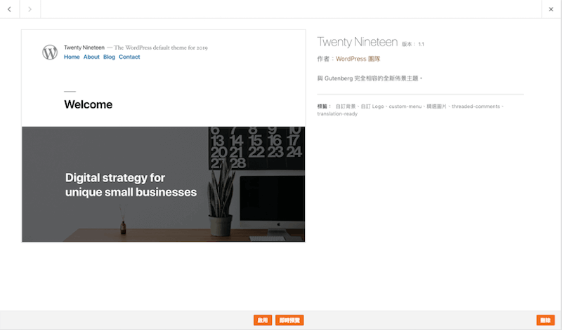 下圖是在 WordPress 網站後台啟用 Twenty Nineteen 主題的畫面,在正下方有即時預覽的按鈕,可以在啟用前先行查看 Twenty Nineteen 顯示網站前端的樣式。