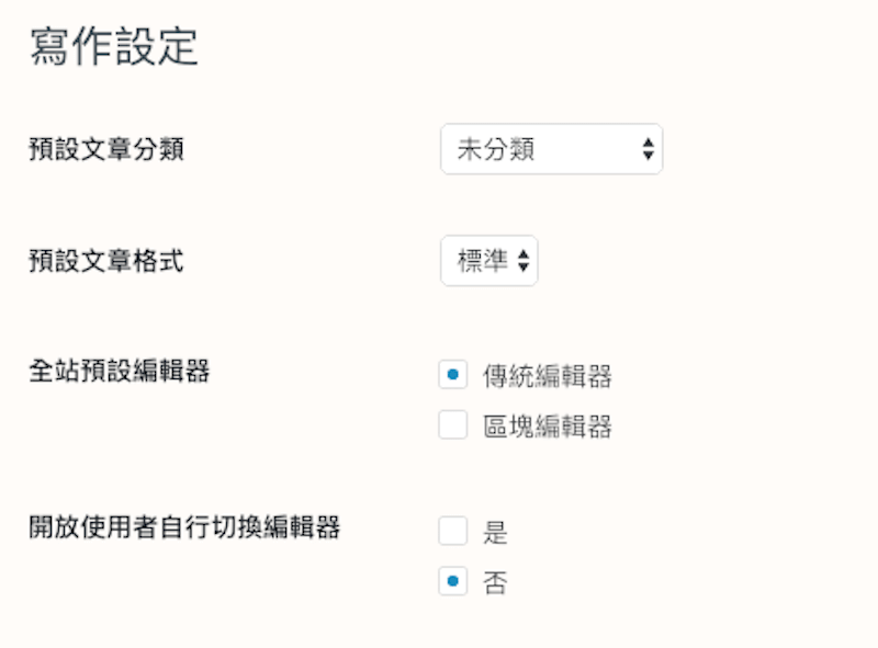 5.0 改版後,在 WordPress 設定選項中的寫作,可以自行定義全網站預設使用的編輯器,以及是否讓網站使用者自行切換不同的編輯器,如果還沒有準備好使用 Gutenberg ,那麼建議先按照下圖指示的選項做設定喔。
