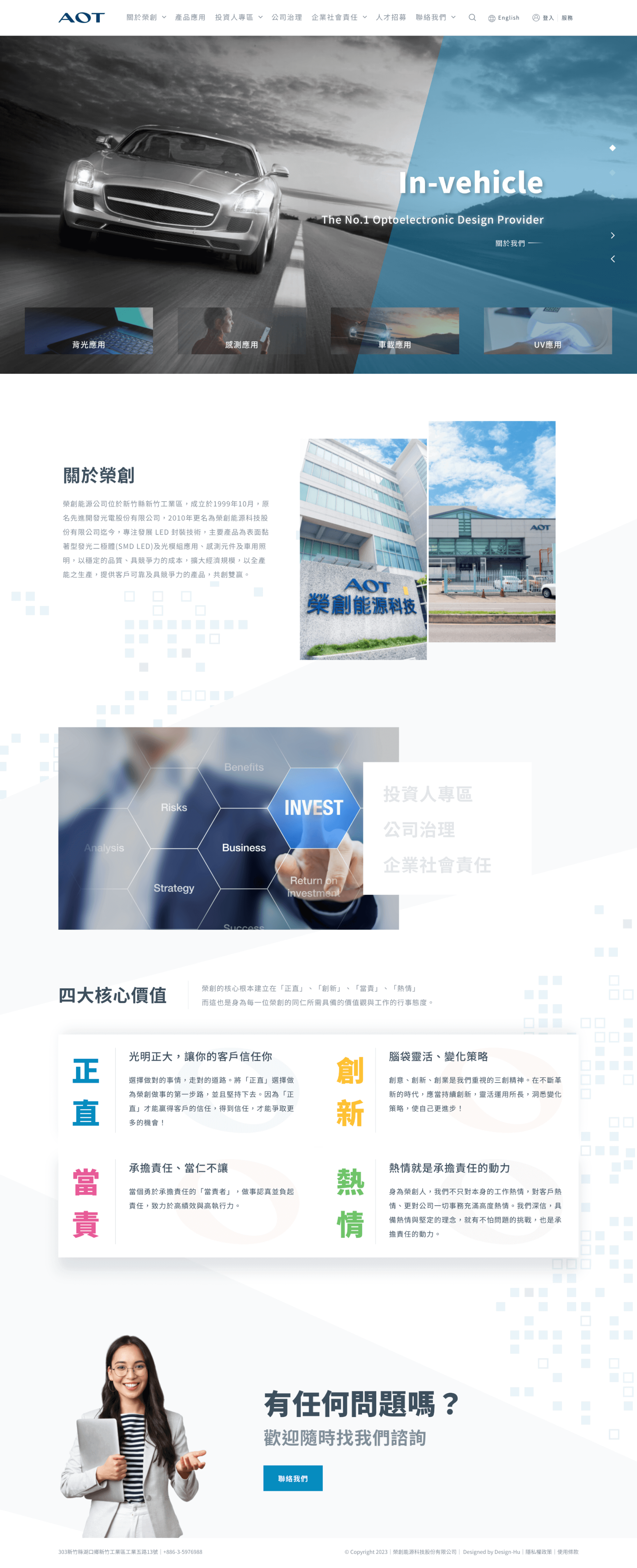 鵠崙設計為榮創科技企業形象官網設立「產品應用」等頁面,及符合金管會規範之「上市上櫃公司網站重要必要揭露事項」,並以中英文語言呈現,讓企業免煩惱,放心開拓事業版圖。