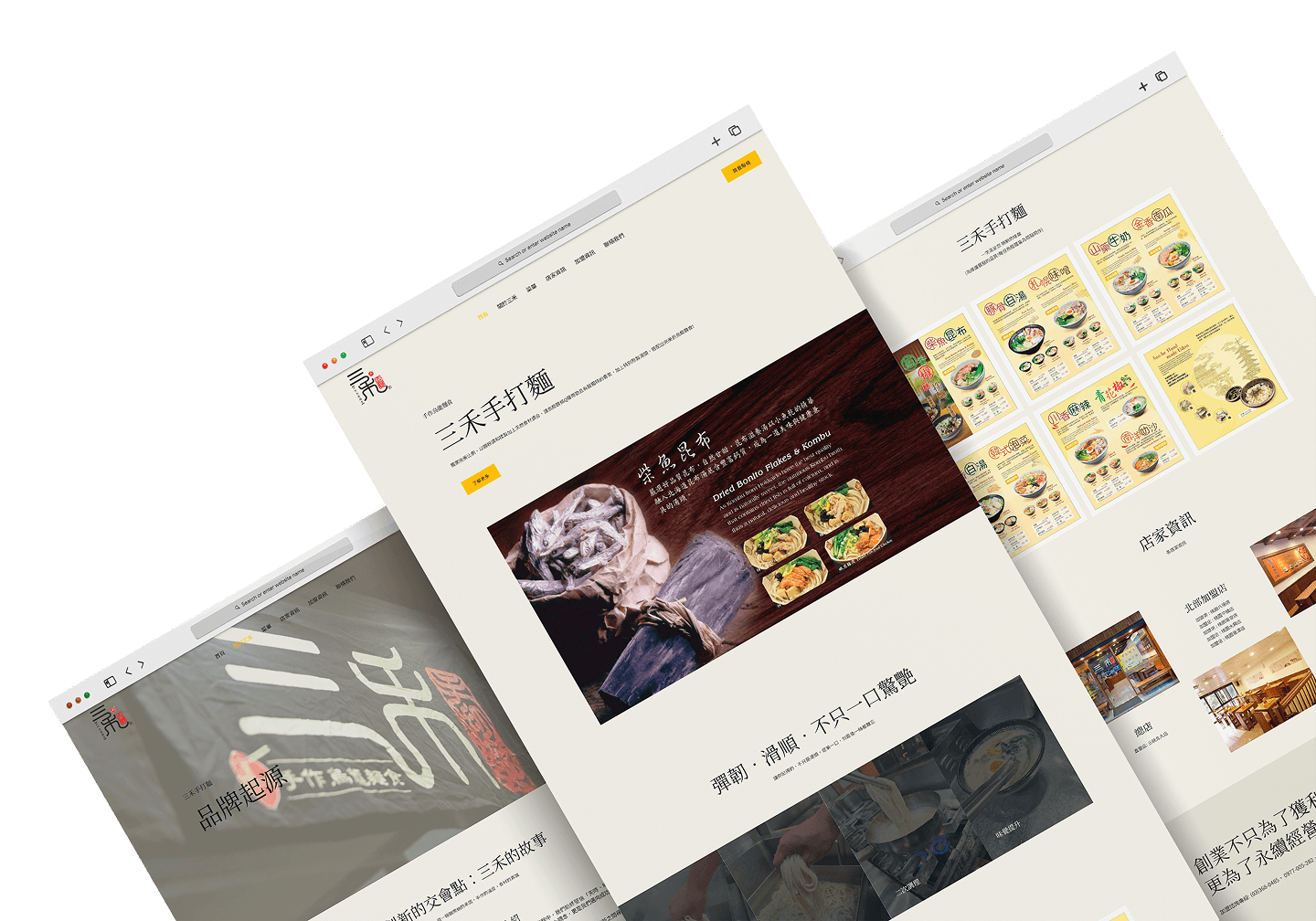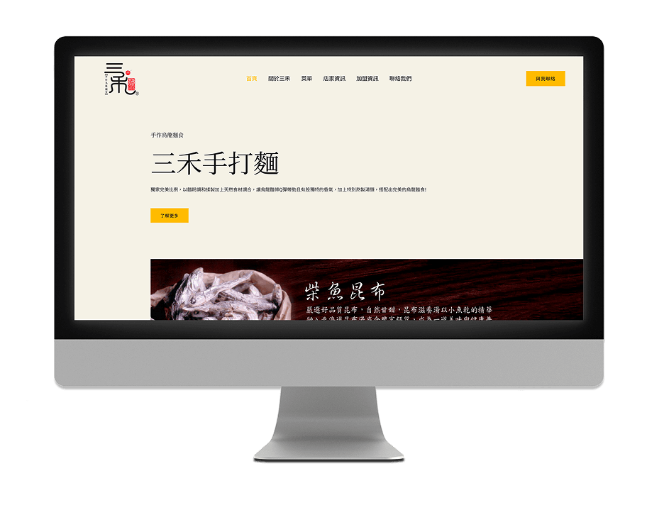 首頁 - 網頁設計 - 三禾手打麵 三禾手打麵網頁設計三禾手打麵是一家主打「手作烏龍麵」的連鎖烏龍麵店 — 強調麵條的彈性與湯頭的獨特風味。以獨家比例將麵粉與天然食材揉製而成,再搭配特製熬煮的湯頭,讓每碗烏龍麵都能兼具 Q 彈、滑順和香氣。 https://www.taiwanudon.com.tw/ 三禾手打麵官網設計理念首頁定位快速傳達品牌核心與特色選單結構與,資訊分類簡潔明瞭、直達需求視覺,品牌風格講故事 + 味覺體驗,多元受眾導向消費者 vs. 加盟商 vs. 新訪客響應式設計 & 使用者體驗(UX)重視 前往官網 https://www.taiwanudon.com.tw/.move_little_top Other其他案例 榮創能源科技 碳權交易所 鎌裕實業 安宏生醫購物 CONTACT US想了解更多資訊內容嗎?歡迎立即聯繫鵠崙設計!