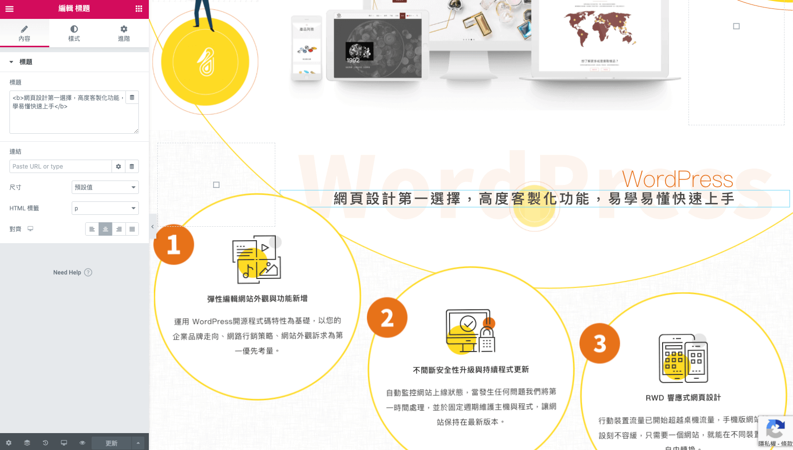 鵠崙設計採用 Elementor 視覺話編輯器,可以按照即時畫面修改網頁,並具有中文化特點。