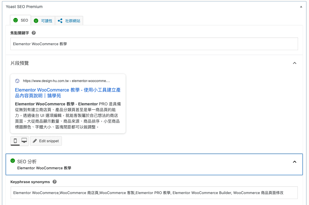 WordPress Yoast SEO 外掛功能可以自由編輯搜尋結果的標題與描述內容,並且可以指定多組關鍵字做內容分析,附註內容行銷策略