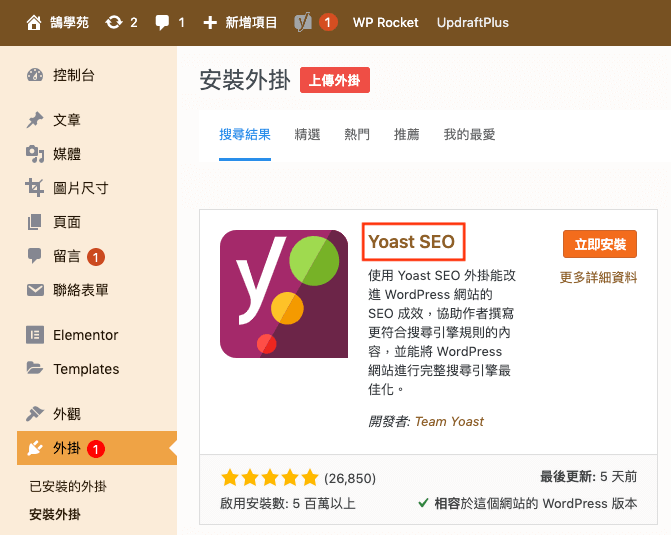WordPress 外掛 Yoast SEO 在優化網站搜尋引擎排名的輔助功能上非常完善,像是可以對網站中所有頁面定義 SERP 中要顯示標題及描述、自動生成網站 sitemap 讓站長可以提交給 Google、Robot.txt 編輯、永久轉址處理 404 頁面(付費版)等,WordPress 可以做的 SEO 優化基本項目,在 Yoast 中都能夠完成,安裝方式也非常簡單,只要在安裝外掛頁面中搜尋就可以完成啟用。
