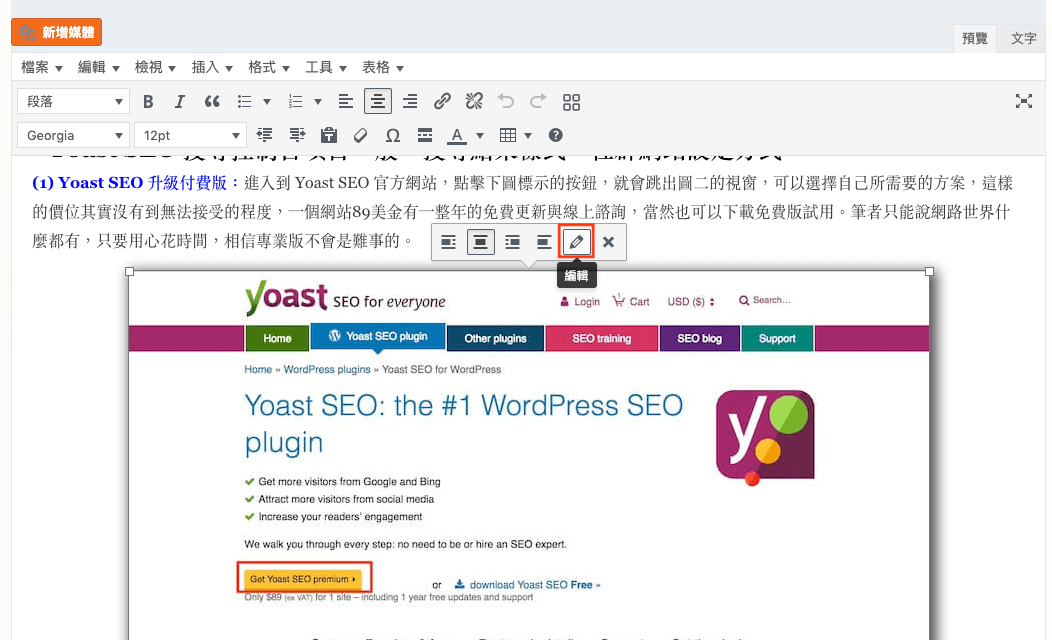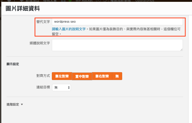 加入的方式很簡單,只要在可視化編輯器中點選圖片上的編輯按紐,就可以在替代文字欄位中加入 ALT 文字作為圖片內容的說明。