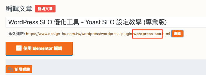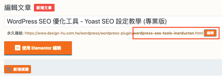在 WordPress 中修改單一頁面的網址名稱非常簡單,在標題下方的永久連結就可以更改網址名稱,如下圖所示。