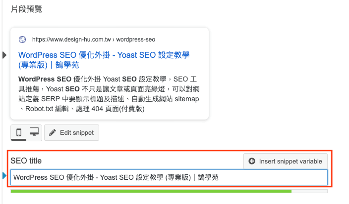 Yoast SEO 在頁面、文章、分類、標籤或者其他自定義的文章格式中,在每一個單一頁面都會有一個編輯 Meta Title 的區域,如下圖所示,請注意,如果編輯欄位下方的色條變為紅色,則輸入再多的文字都不會顯示在搜尋結果中。
