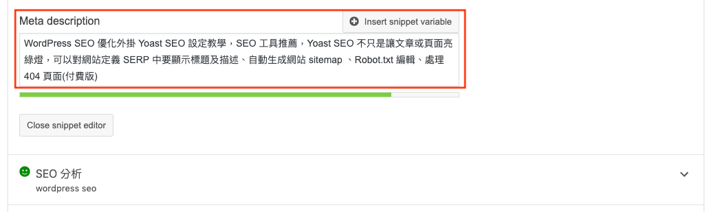 設置方式在與 Meta Title 相同,Google 目前限制字元數為 150~170 ,只要下方的色條變為紅色,同樣多餘的字就不會顯示。