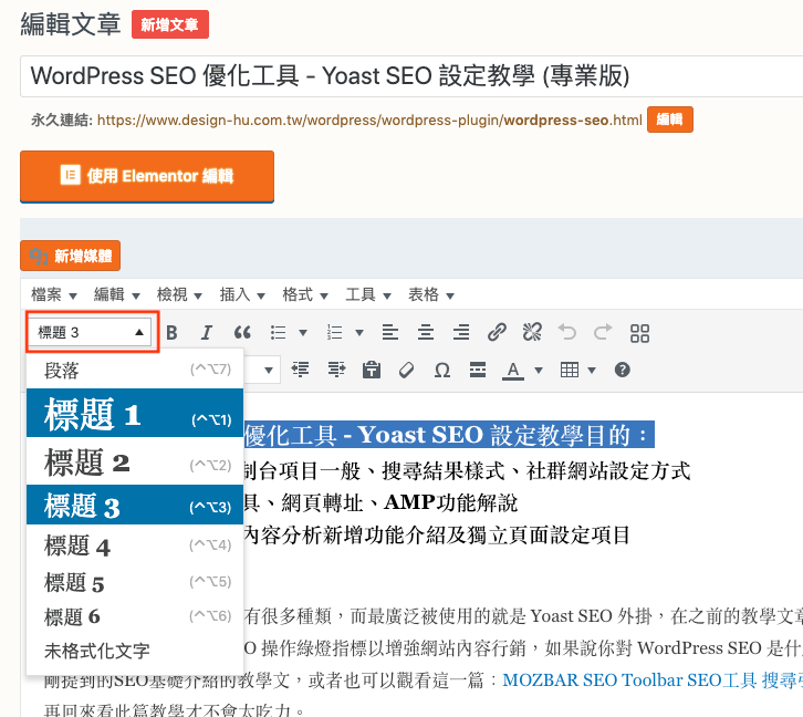 在做法上,WordPress 預設的可視化編輯器中可以為文字加入不一樣的標題標籤,只要將想要標記的文字選取,在點選左上角的標題標記下拉清單,就可以完成標題文字的建立。